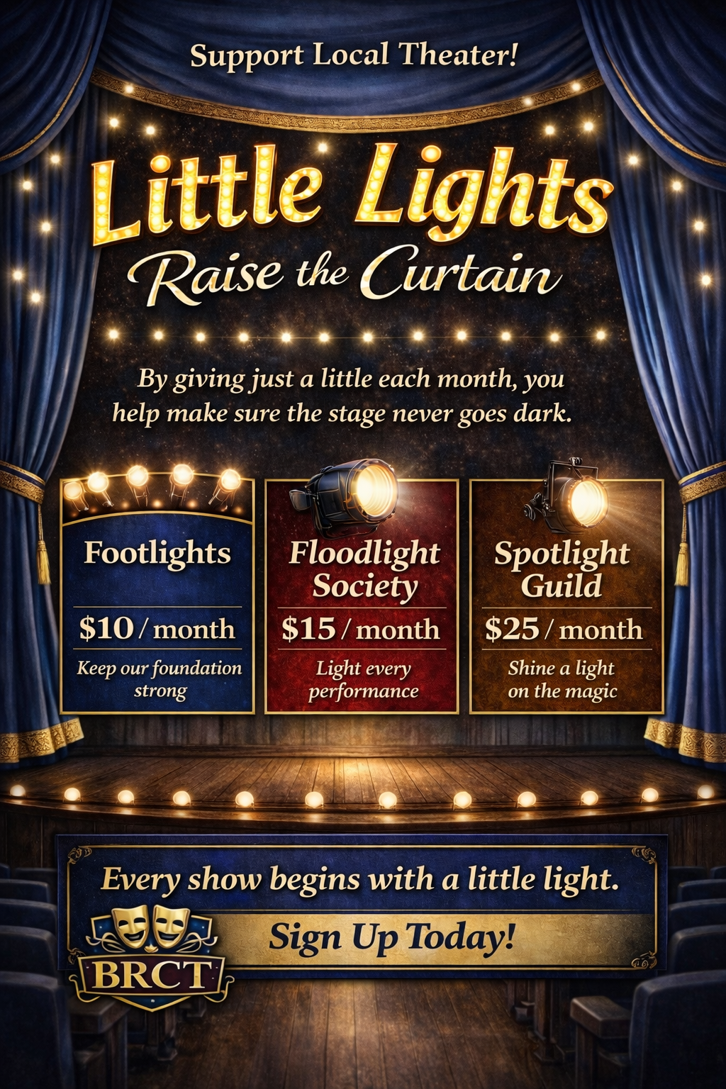 Community theater lives show-to-show, ticket-to-ticket. Monthly donors are what turn “we hope this works” into “we know we can keep going.”